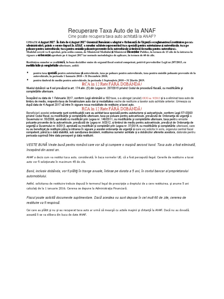 Din păcate, guvernanții nu au spus încă dacă vor apela la această soluție și, cel mai important, ce se va întâmpla cu vehiculele pentru care a fost deja plătită o taxă de poluare, în orice formă a sa, iar aceasta nu a fost încă recuperată. Financial service in iasi, romania. Cererile de restituire a taxei auto vor fi soluţionate în maximum 45 de zile. Taxa auto se poate recupera numai prin instanta ! 52/2017 din 4.page 1 of 7 oug nr.