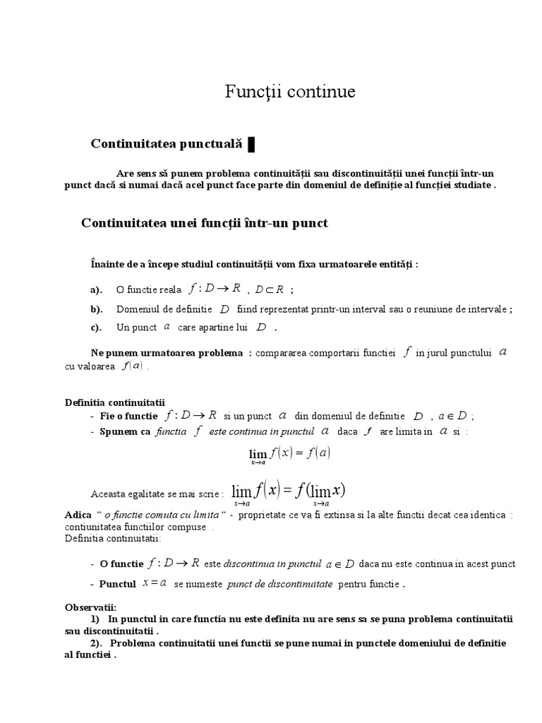 vizitati articolul complet aici : https://ro.scribd.com/doc/96297548/Functii-Continue Primul caz de discontinuitate care se naște este acela în care există: Limitele laterale sunt diferite, deci punctul x = 0 este punct de descontinuitate de speța i. Am un exercitiu care imi cere sa determin punctele de discontinuitate de speta i si ii la urmatoarele functii.