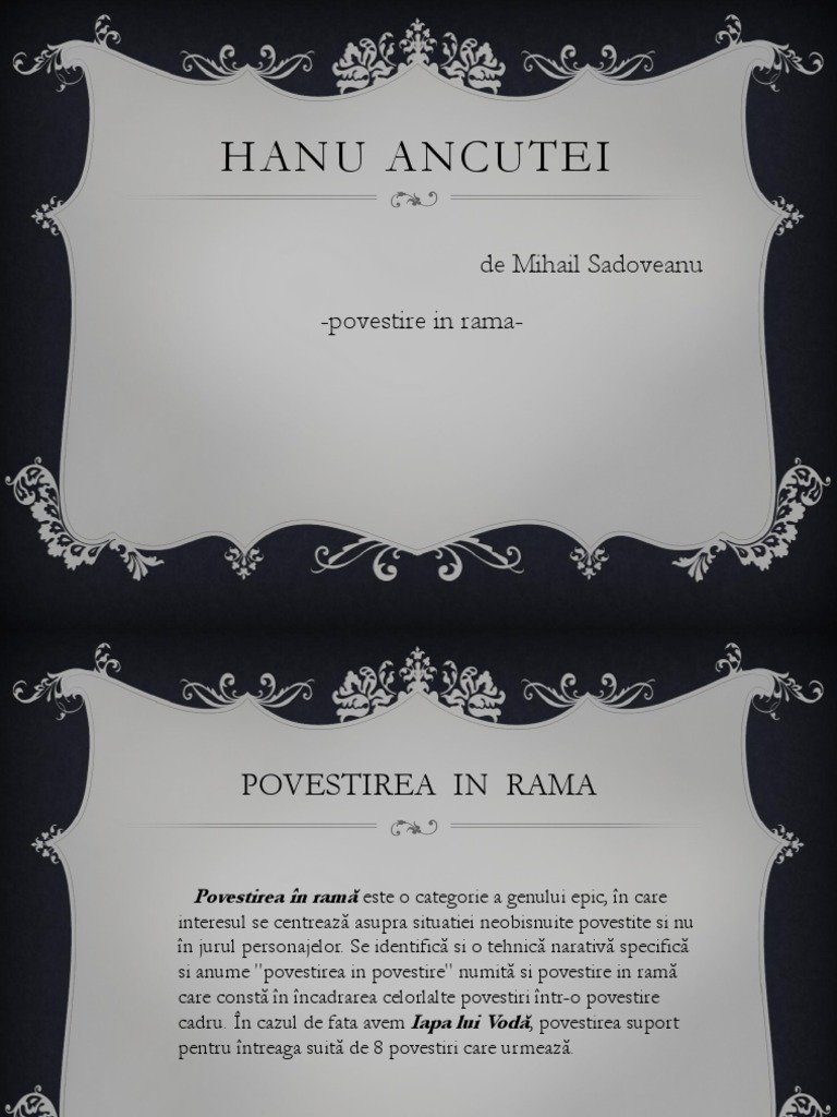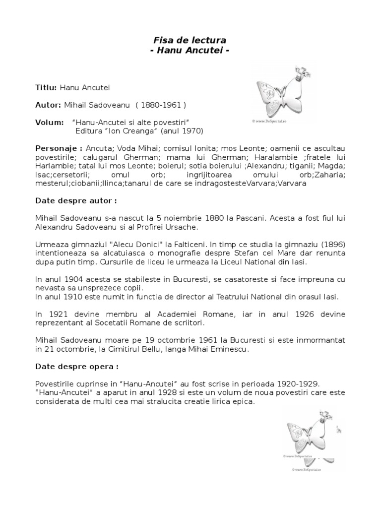 Trebuie sa stiti dumneavoastra ca hanul acela al ancutei nu era han, era cetate. Diversi naratori la hanul ancutei.hanul este un motiv literar present frecvent in literature romana,la slavici,caragiale,dar o data cu sadoveanu acesta devine o tema literara,fiind prezent in foarte multe opere,fie ca loc de popas si petrecere,loc in care se petrec lucruri ciudate. Test de lectura hanul ancutei.